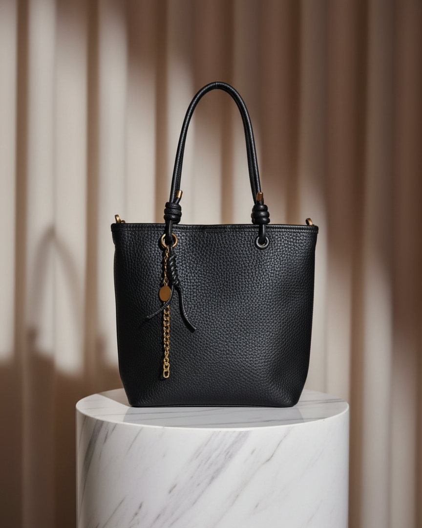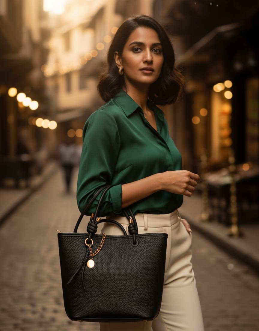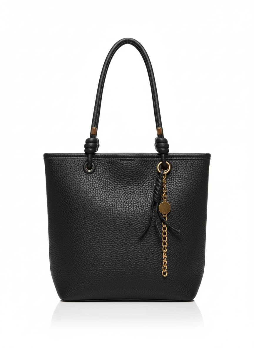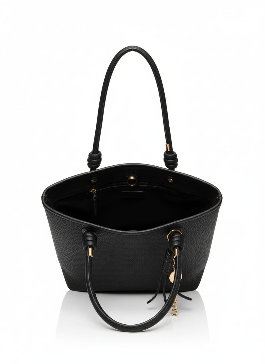 The sturdy double handles with chic knot detailing offer comfortable carrying, while the gold-tone accents add a refined touch of luxury. Lined with a smooth inner fabric, this tote ensures durability without compromising on style. Whether you’re heading to the office, a brunch date, or a quick shopping trip, this black tote is your go-to choice for effortless elegance.